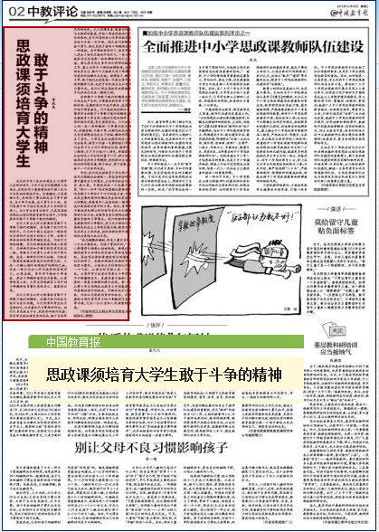 在庆祝中华人民共和国建设70周年大会的讲话中,习近平总书记铿锵有力地指出,没有任何力量能够阻挡中国人民与中华民族的前进程序。祸乱滔天,方显英雄本色,党的伟大事业都是在斗争中降生、在斗争中生长、在斗争中壮大的。我们急需千百万继续民族再起大任的时代新人。在大学生培育历程中,尤其是高校头脑政治理论课教育教学历程中,必需作育他们敢于斗争敢于胜利的精神。