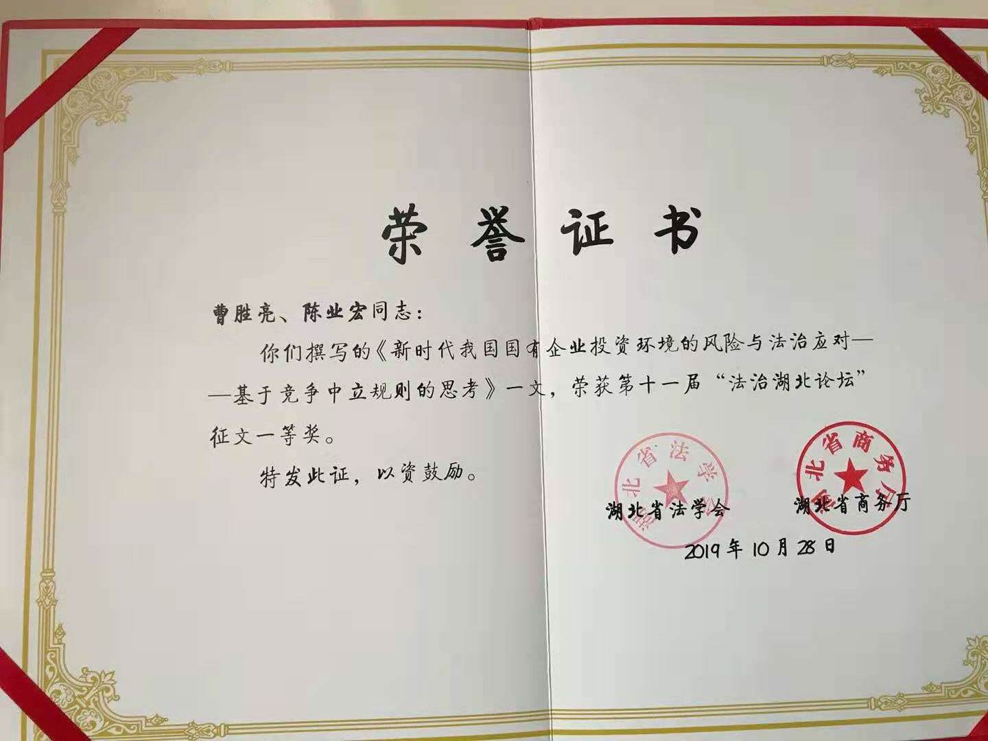 2019年10月30日,第十一届“法治湖北论坛”在武汉市洪山宾馆举行。本届论坛由湖北省法学会、湖北省商务厅主理,湖北省外商投资企业协会协办。湖北省法学会会长傅德辉主持论坛主旨报告会,湖北省副省长杨云彦出席论坛并揭晓主要讲话,商务部外资司副司长叶威作了题为“《外商投资法》的立法配景与外商投资的法治包管”的主旨演讲。省委政法委副书记、省法学会党组书记、常务副会长刘太平出席论坛并主持了论坛总结。我院院长曹胜亮教授应邀出席论坛并作主题讲话。