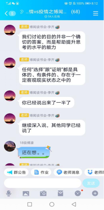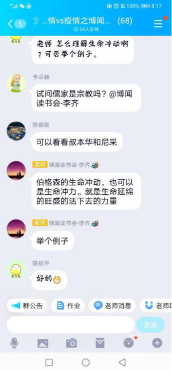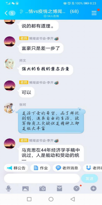 (通讯员 刘许超)新冠肺炎疫情时代,在先生们的向导和指导下,马院学子以笔为友、以书为伴,养成了“好念书,读好书”的习惯。2020年4月8日,在武汉正式扫除封城之际,马院学子开展了以“在生长中掌握人生意义”为主题的念书交流会。本次念书会通过QQ平台举行,由李齐先生主持,2018级与2019级部分硕士研究生加入了念书会。