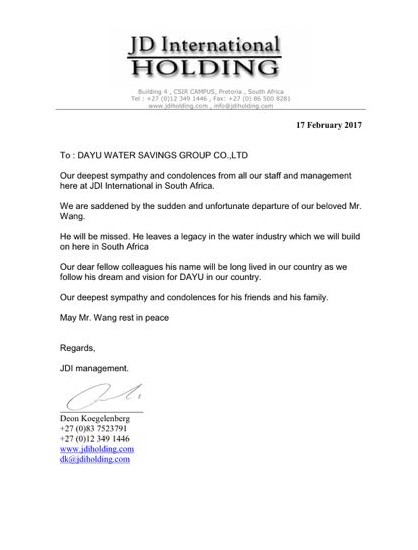 南非JD国际公司唁电