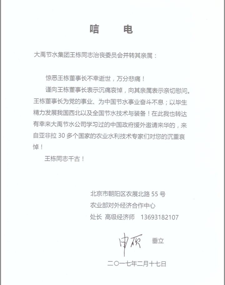 农业部对外经济合作中心申硕处长唁电
