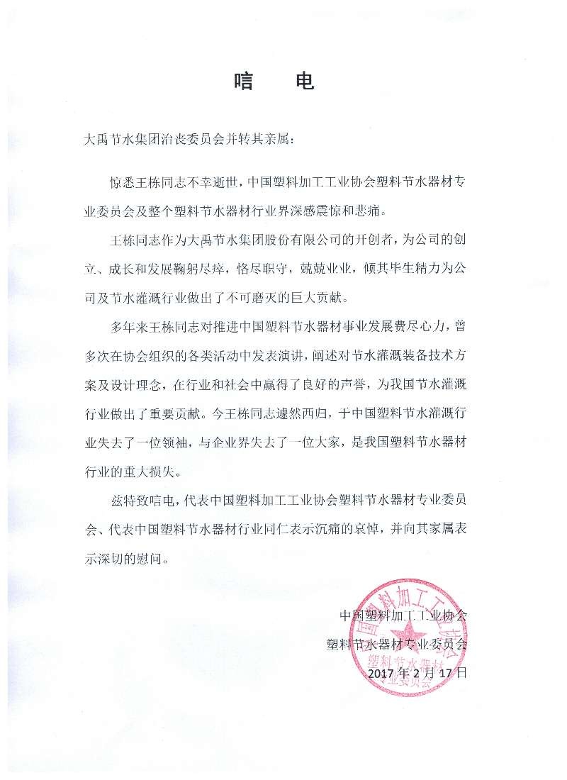 中国塑料加工工业协会塑料节水器材专业委员会唁电
