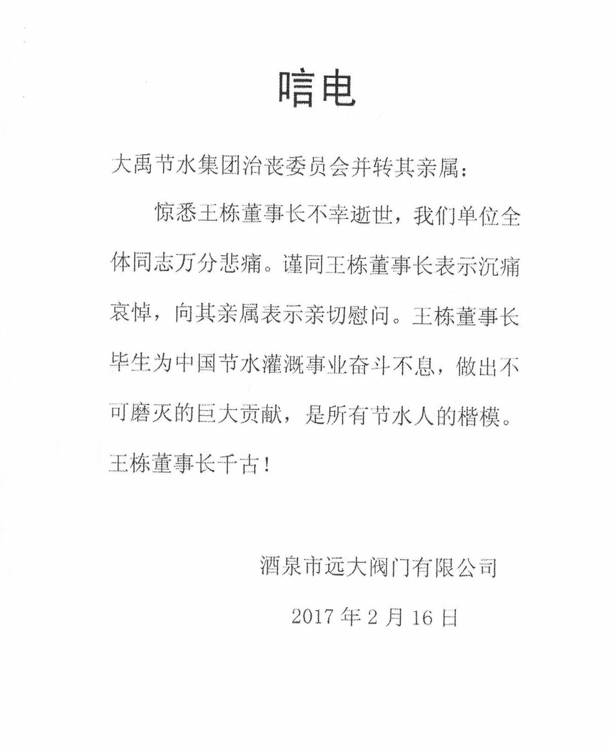 酒泉市远大阀门有限公司唁电