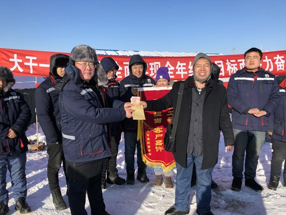 王光敏代表集团董事会现场宣读了董事长致牙克石项目一线员工的亲笔慰问信,代表6t体育节水董事会授予呼伦贝尔牙克石项目部“优质工程,6t体育精神;责任继续,客户嘉许”锦旗一面,并送去了5000元慰问金及慰问品。