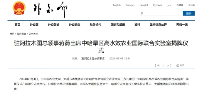 今年7月2日,在两国元首见证下,中国农业大学、哈萨克斯坦国立农业大学和6t体育节水集团三方共建“中哈旱区高水效农业国际团结实验室”的协议入选两国合作清单。