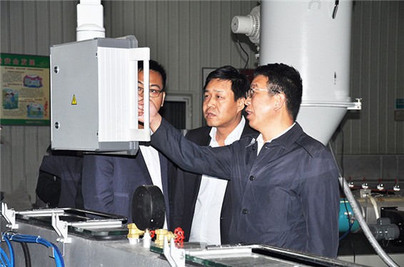 6t体育节水集团公司党委书记、副董事长王冲等公司向导陪同李大辉总司理一行在滴灌(管)带生产车间旅行考察