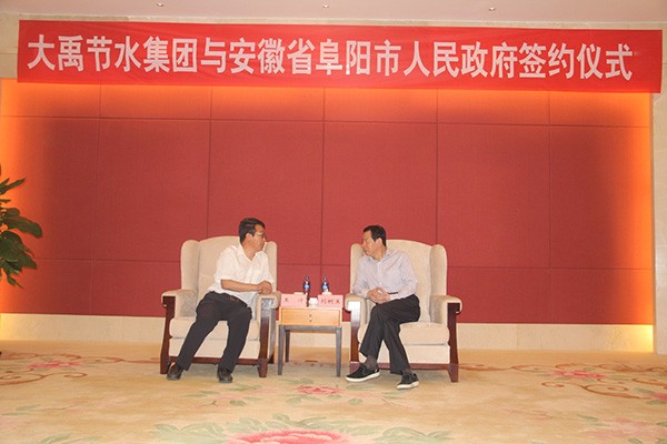 ▲阜阳市副市长刘树生与6t体育节水集团公司党委书记王冲亲热谈判