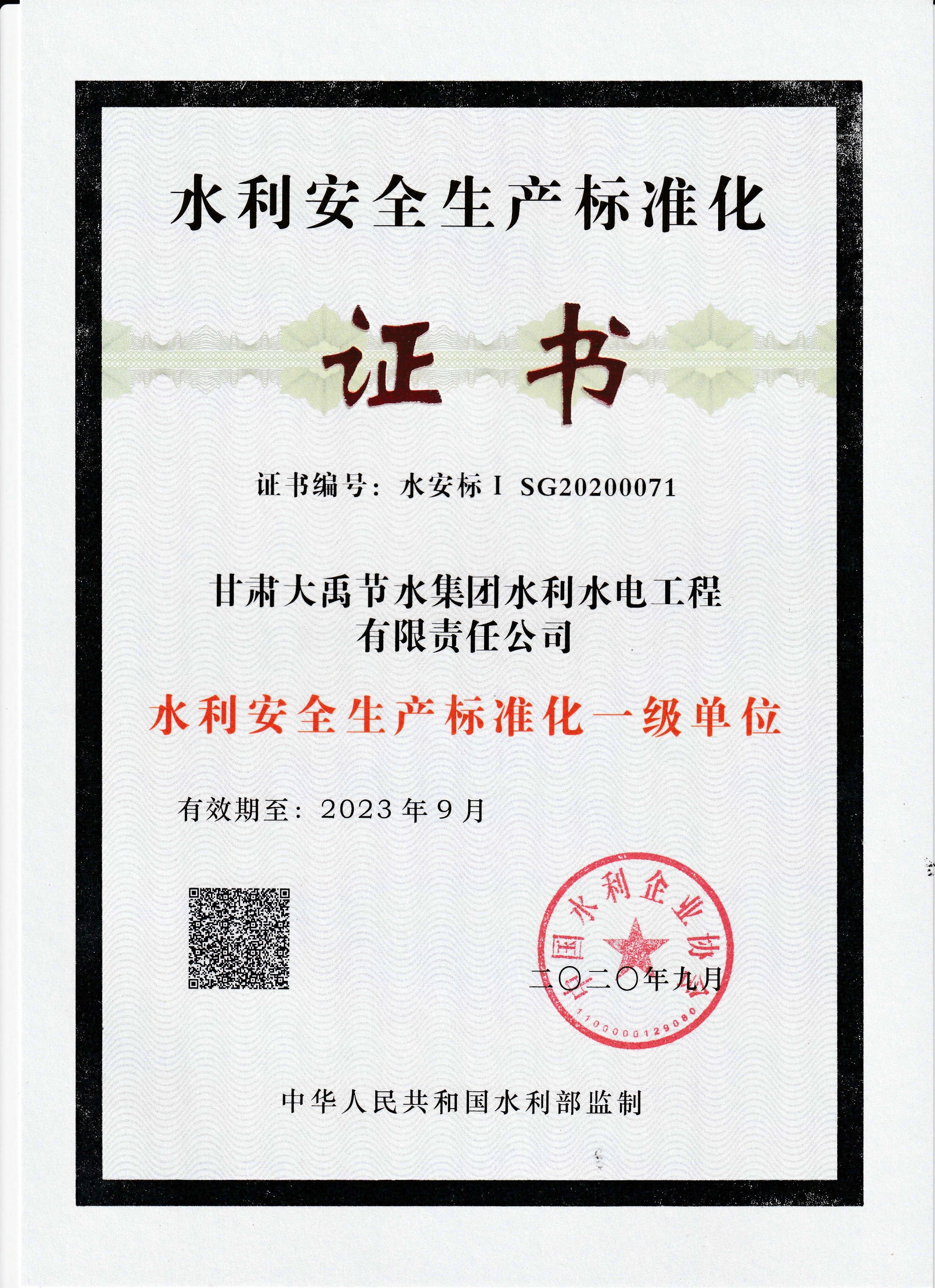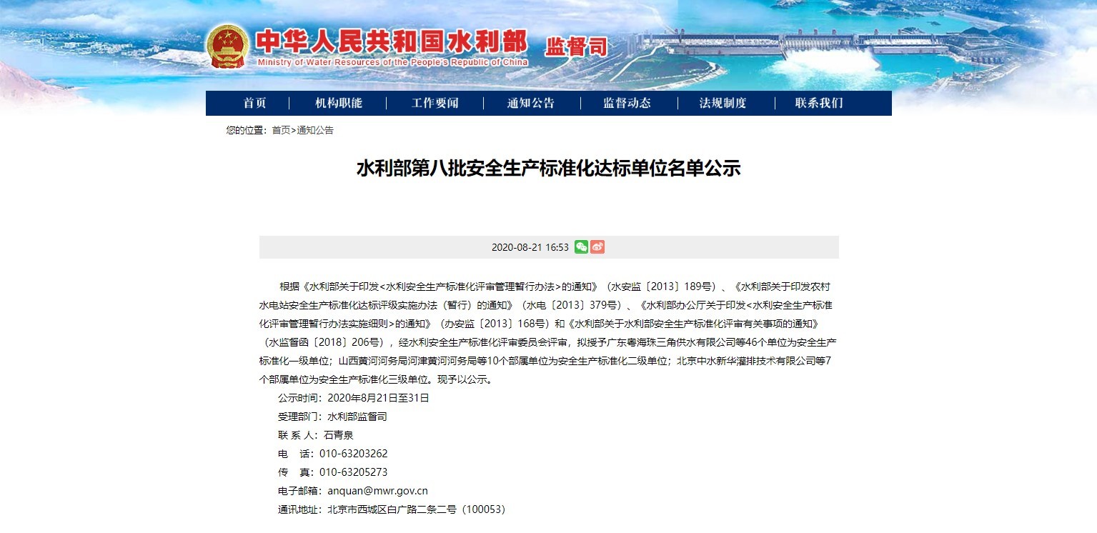 2020年08月21日,国家水利部官网宣布了第八批清静生产标准化达标单位公示名单,6t体育节水集团水利水电工程有限责任公司被授予“水利清静生产标准化一级单位”称呼,是水利施工行业清静生产标准化最高品级。