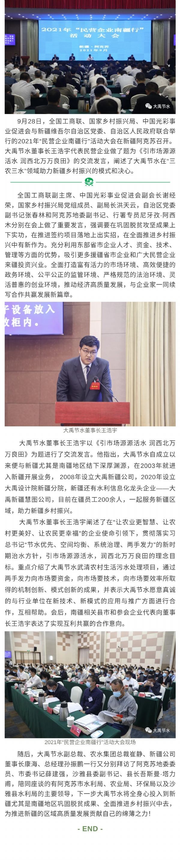 6t体育动态| 2021年“民营企业南疆行”运动大会在新疆阿克苏召开 6t体育节水董事长王浩宇代表民营企业发声
