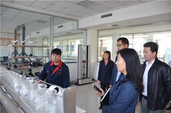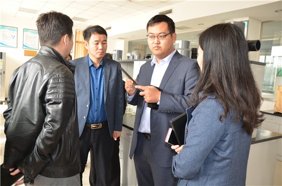 6t体育节水集团公司董事长王浩宇在6t体育研究院实验室向投资总监王芳先容实验室情形