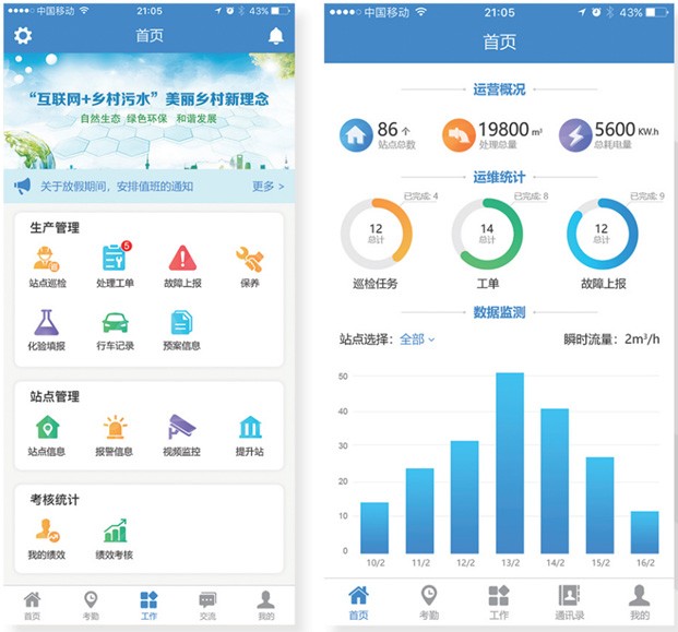 对污水处置惩罚站点按区域制订响应巡检妄想以及巡检周期,凭证远程监测情形和自动报警信息远程派发工单至移动APP,高效完成巡检、工单使命,使命流程全程羁系、事务可追溯、自动汇总统计完成情形。